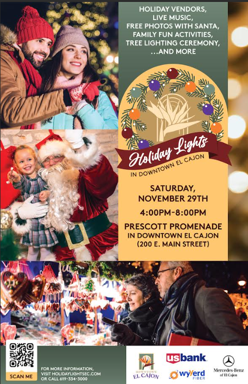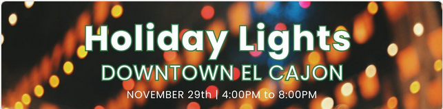 Kick off the holiday season at Holiday Lights in Downtown El Cajon on Saturday, November 29th, from 4:00 p.m. to 8:00 p.m., featuring festive fun for the whole family including trackless train rides, live music, holiday vendors, a business walkabout with prizes, free photos with Santa, and more.